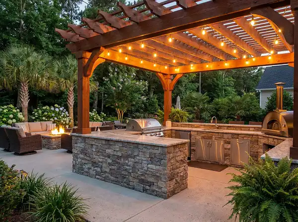 Transform your backyard into a year-round entertaining space with custom outdoor kitchens, pergolas, and living areas.